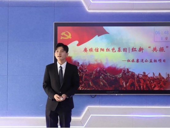 荣获一等奖的“庚续信阳红色基因 红新‘共振’”项目,励志将红色文化以创新的方式发扬光大,表达青年一代爱党爱国的赤诚之心,将红色基因深植于人们心中。项目以讲好总书记在信阳视察时所提出的“四个故事”为主旨,追寻文物、文化产品等红色印迹,宣扬红色文化,赓续红色基因。