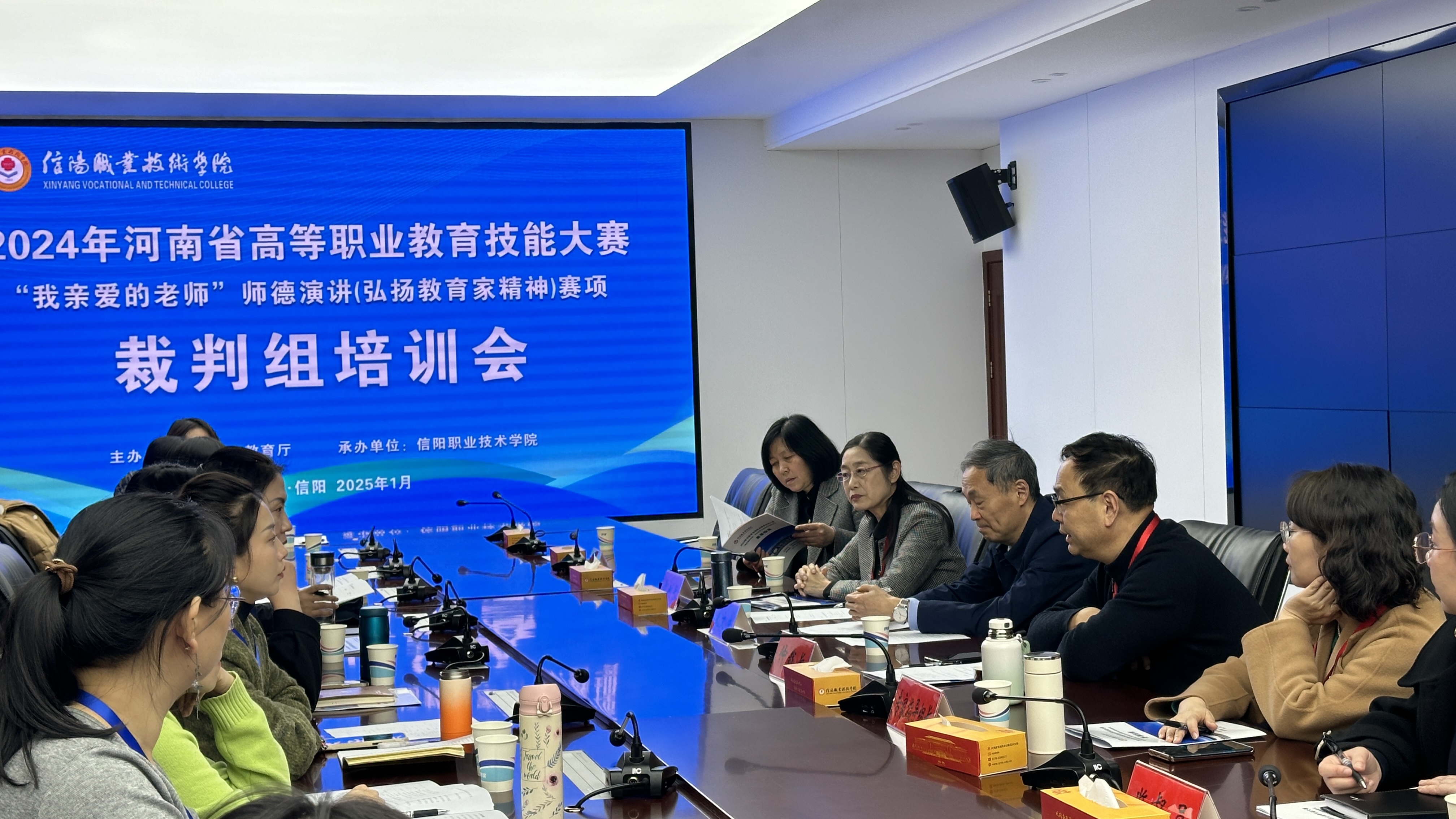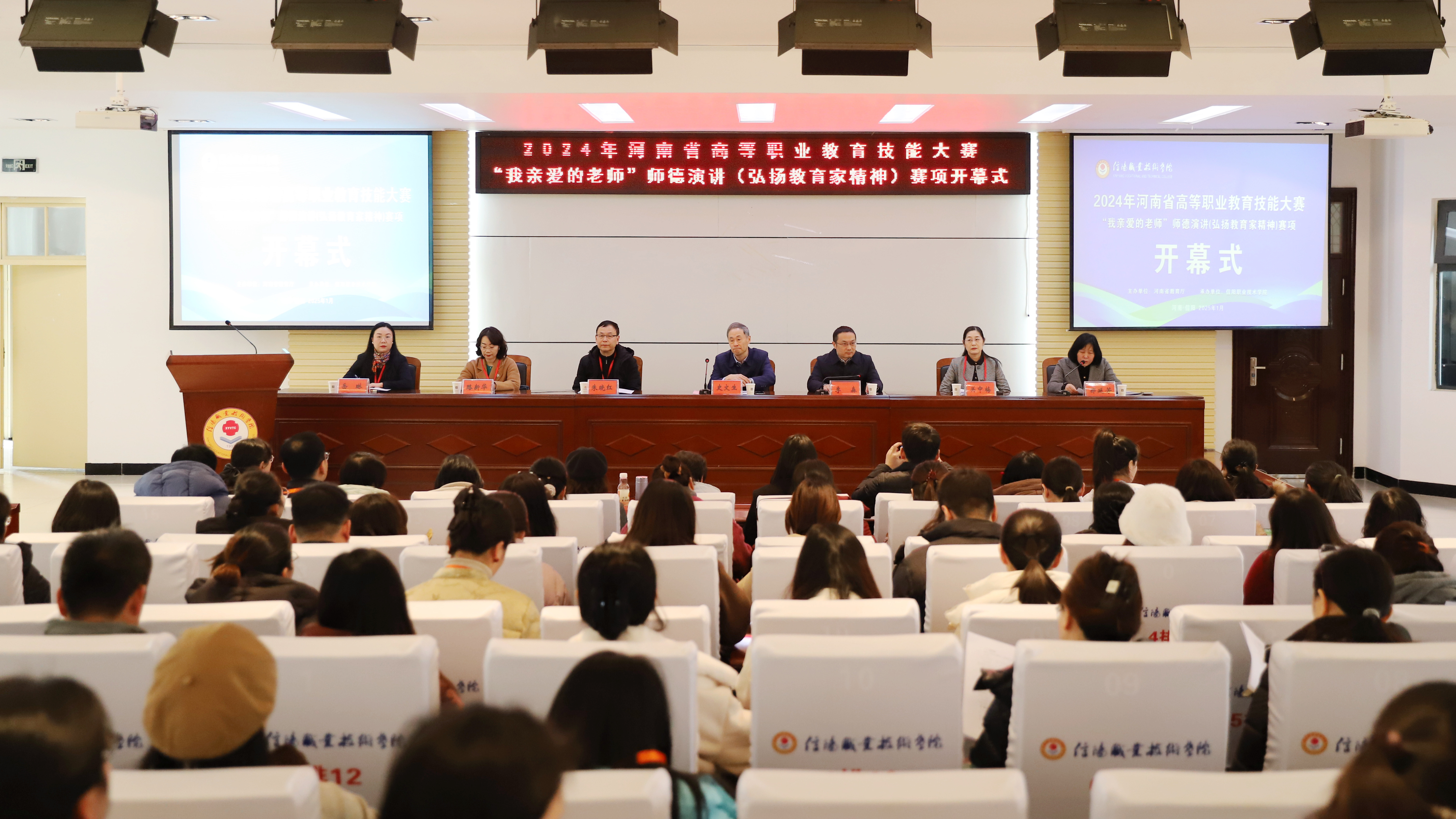 1月7日至8日,2024年河南省高等职业教育技能大赛“我亲爱的老师”师德演讲(弘扬教育家精神)赛项在信阳职业技术学院成功举办。来自河南省的91所高校、166支队伍齐聚信阳职院,展开了激烈的角逐。1月7日下午,河南省教育厅职成教处一级调研员史文生,信阳职业技术学院校长李森,本次大赛仲裁长、漯河职业技术学院副校长朱晓红,大赛裁判长、许昌职业技术学院副校长关中梅,大赛专家组指导组组长、新乡职业技术学院人事处处长路新华,大赛监督员、三门峡职业技术学院教授岳琳以及大赛裁判员、各校领队和指导老师、选手等参加开幕式。学校副校长郑延芳主持开幕式。