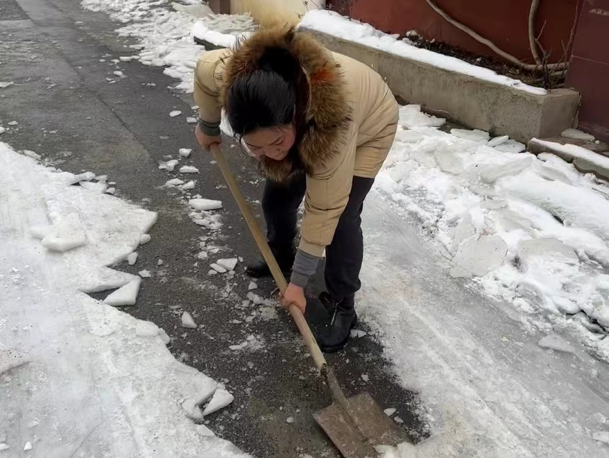 在活动中,党员志愿者们弓起身子,抡起铁锹,挥着铁铲,全力清除道路中的积雪,为群众开辟安全道,用“小行动”保障“大民生”。原本被厚重冰面覆盖的道路,经过党员志愿者团结协作,又恢复成最初的模样。