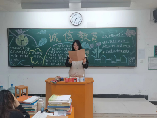 班会伊始,班委向同学们解释诚信的含义,即待人处事真诚、老实、讲信誉、言必行、行必果。通过对含义的解释使其理解“诚信”对于学生自身发展和为人处世的重要意义。各班以“诚信作业”为切入点,让同学们踊跃发言,寻找自身在诚信方面的缺失,然后通过组织讲诚信故事、集体宣誓等多种方式,使诚信的种子扎根于每一位学生心中。最后同学们还一起回顾了学习的主要内容,巩固学习成果。会后,同学们将理论知识精读细研运用于实际。