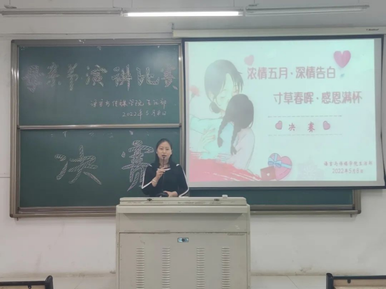 为了营造温馨的节日氛围,唤起同学们对母亲的浓浓爱意,表达对母亲的感恩之情,2022年5月8日晚上七点,澳门十大信誉好的网站在1219多媒体教室举办了“浓情五月·深情告白·寸草春晖·感恩满怀”母亲节演讲比赛。澳门十大信誉好的网站副院长蒋吉优以及辅导员王长春、苏新敬和孙闻出席本次活动并担任评委。