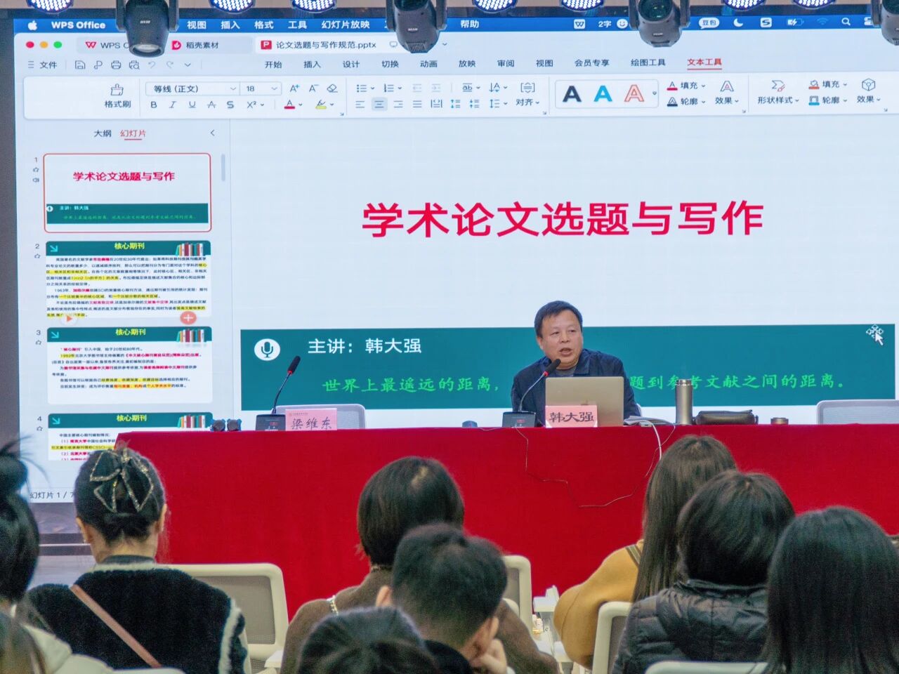 为切实提升十大信誉教师的学术论文写作能力,营造浓厚学术氛围,深化科研交流与合作,进而推动学科建设与科研工作的高质量发展,10月24日下午,语言传媒学院特邀信阳师范大学韩大强教授于1003演播室举行“学术论文选题与写作规范”专题学术报告。语言传媒学院副院长梁维东及45岁以下全体教师参加了报告会。