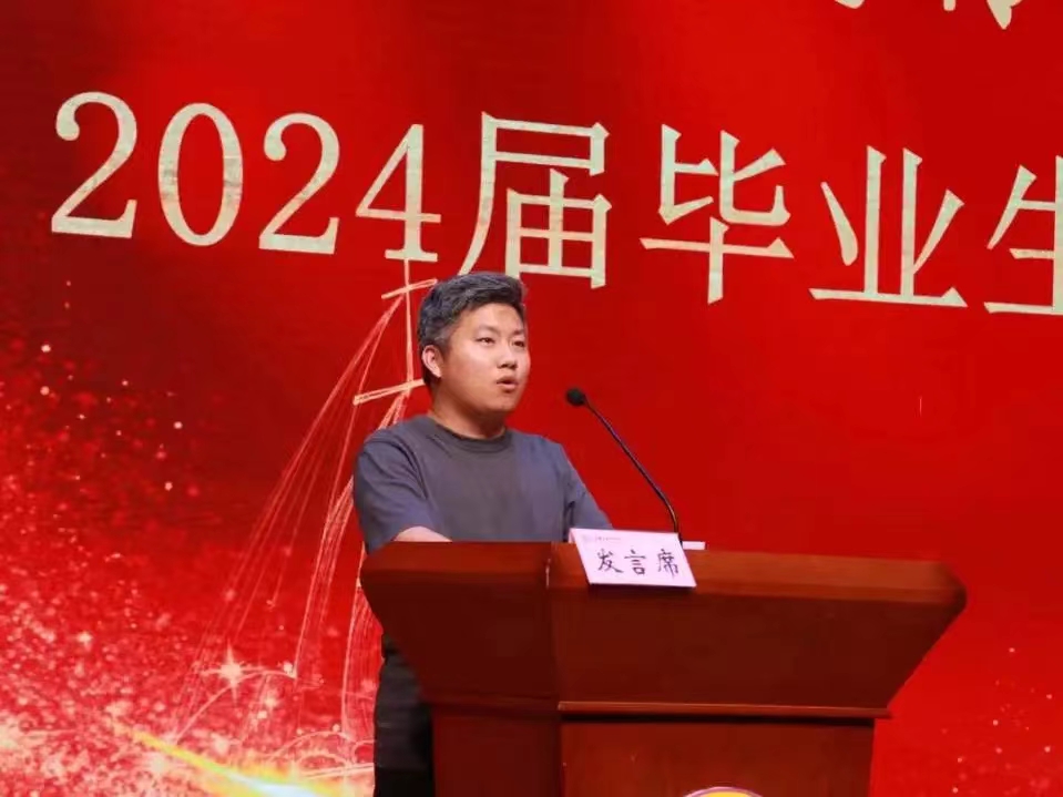 教师代表苏新敬发言,他祝贺同学们顺利毕业,并感谢同学们和老师共同成长。苏新敬老师希望同学们以梦为马,不负韶华在未来的道路上,不忘初心,砥砺前行,用自己的努力创造更美好的明天。